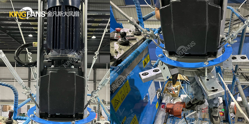 3、安裝車間大型吊扇支架時,一定要讓支架與地基平面水平穩固,必要時在車間大型吊扇旁安裝角鐵進行再加固。
