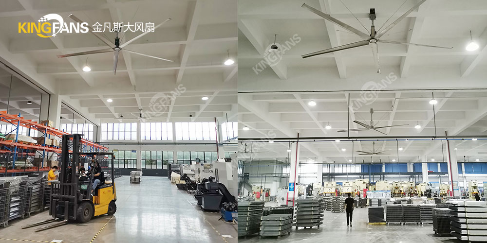 Kingfans工廠大風扇,低轉速、高風量,覆蓋面積廣,全面覆蓋人體,有效降低人體溫度4-7℃。非常適合工廠車間這種高大空間的降溫散熱。可以根據車間的面積合理分布工業大風扇的安裝數量。Kingfans工廠大風扇使用壽命長,免維護,省心節能環保。自然柔和立體風,吹著更舒適。