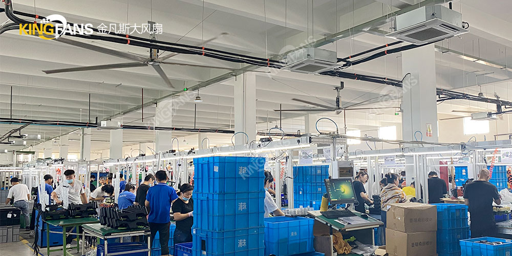此次安裝廠房大吊扇的車間是注塑車間。面積在9160m2,共計安裝DW系列大風扇6臺。廠房大吊扇7.3米大直徑,強力攪動氣流,有效促進空氣循環流通。全方位、無死角巨量氣流,帶走廢氣,通風換氣。模擬自然風覆蓋人體,吹著不頭痛、不會出現渾身酸痛的現象。有效降低人體溫度3~5℃。